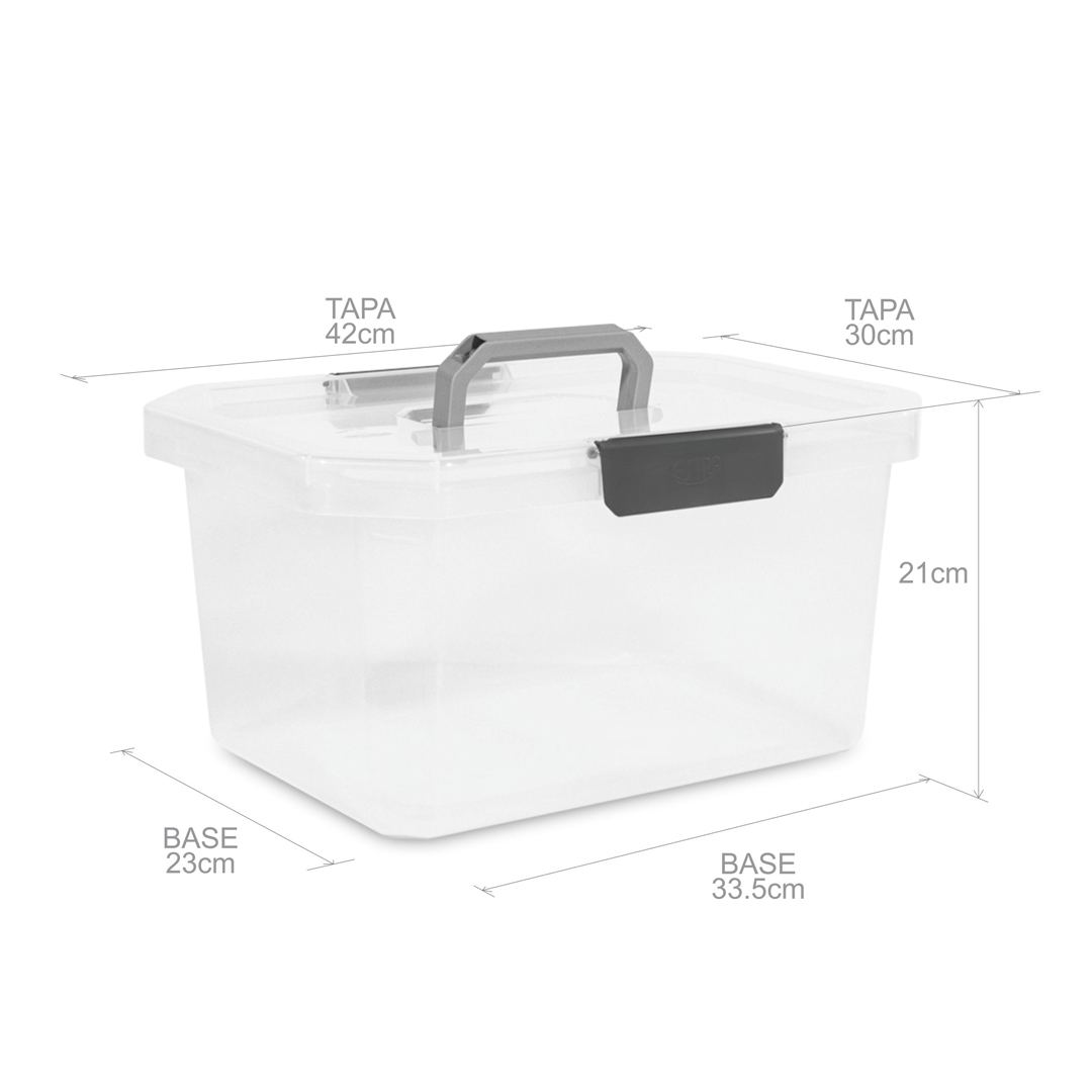 Caja organizadora con broches y tapa con manija logrando que todos tus objetos estén siempre protegidos y almacenados en un solo lugar, dando orden a todos los espacios.Su cuerpo y tapa transparente facilitan ver su contenido, mientras ahorras y maximizas tus espacios para tener todo a la mano en cualquier instante. Su diseño y forma curveada en las esquinas hace que el producto sea más resistente. Ideales para mantener el orden. Por su diseño permiten ser complementadas con cajas de otras capacidades aplilandolas entre si.