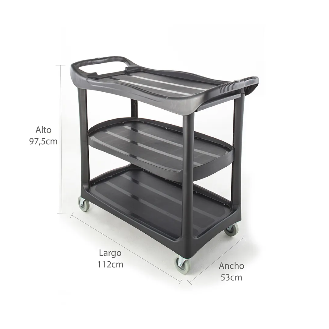 Estos carros de servicio 3 niveles negros son muy versátiles, pues gracias a sus divisiones es posible llevar diferentes tipos de productos como platos, bebidas, suministros de limpieza e incluso equipo médico, de manera organizada.