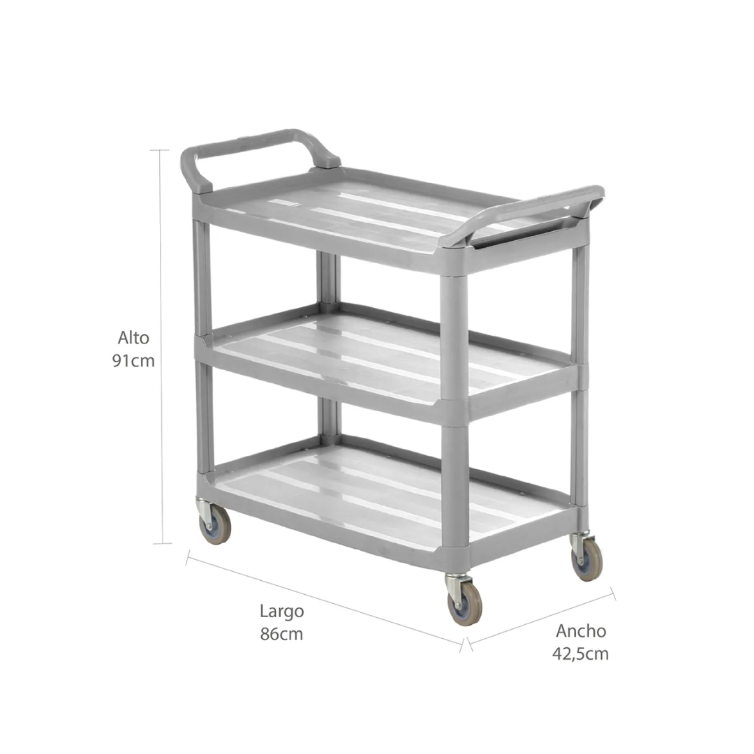 Con dimensiones de 86 cm largo x 42 cm ancho x 91 cm alto, los carros de servicio 3 bandejas medianos son lo suficientemente amplios para almacenar diferentes tipos de productos, posibilitando la separación adecuada de ellos según su composición o destino final