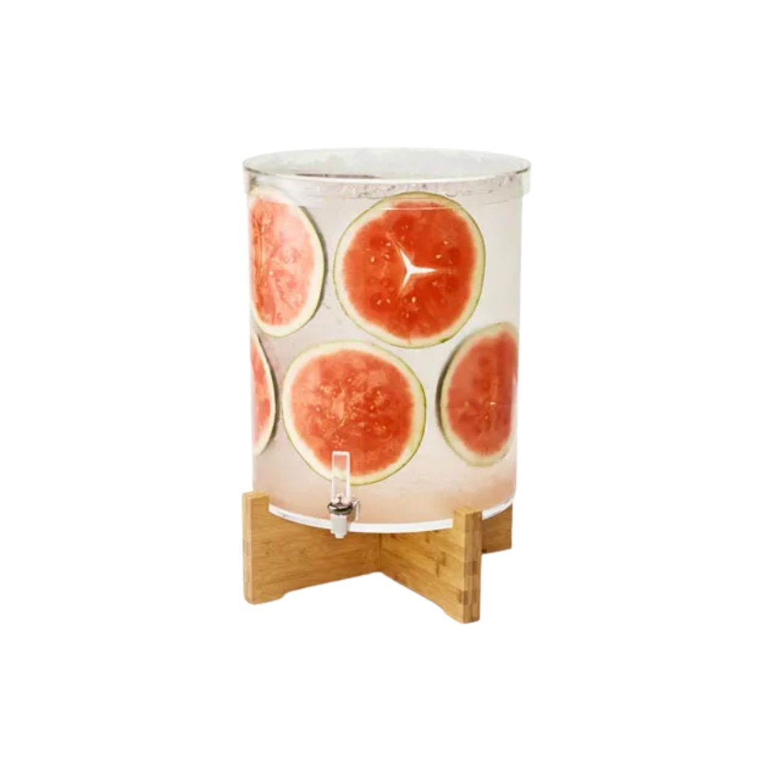 Dispensador de bebidas redondo, recipiente y grifo de acrílico transparente, base de bambú.