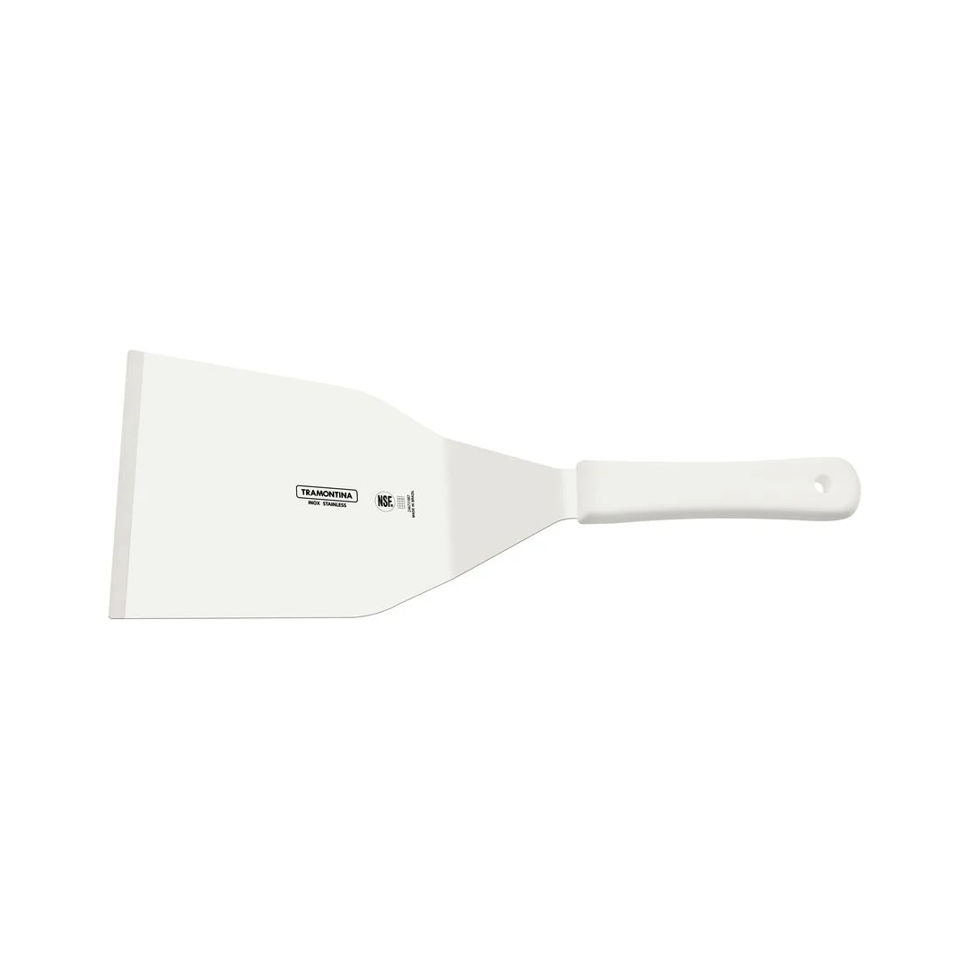 Al preparar recetas, tenga la facilidad de transferir el contenido a los recipientes con la espátula raspador Tramontina Profesional con lámina en acero inoxidable y mango de polipropileno blanco