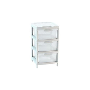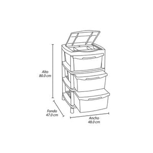 Mueble organizador con tres gavetas grandes, con sistema que evita que se salgan fácilmente. Resiste hasta 25 kg por gaveta. Manijas que permiten su fácil uso.Tapa organizadora con compartimentos para clasificar. Fácil de limpiar. Incluye 4 tacones y 2 rodachinas