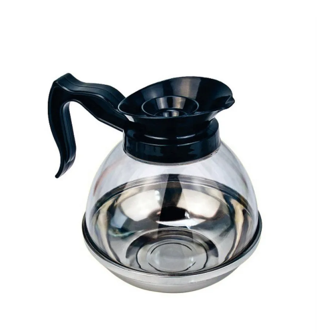 Recipiente en policarbonato transparente. Base en acero inoxidable. Manija ergonómica y vertedero en plástico. Para uso en calentadores de jarras y máquinas de café por goteo.