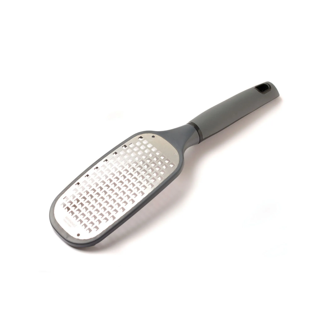 Fabricado en acero inoxidable. Mango elaborado en plástico antiadherente gris de moderno y atractivo diseño. Posee un borde antideslizante para un uso firme y seguro. Ideal para rallar todo tipo de alimentos. Especialmente, quesos duros, vegetales, hortalizas, frutas y nueces. Fácil de limpiar y almacenar.
